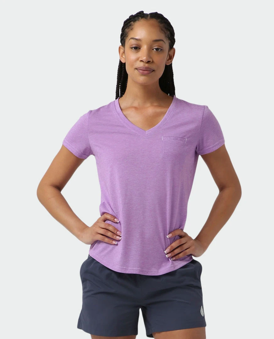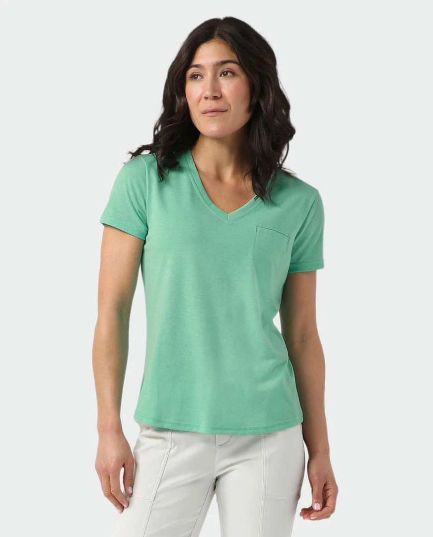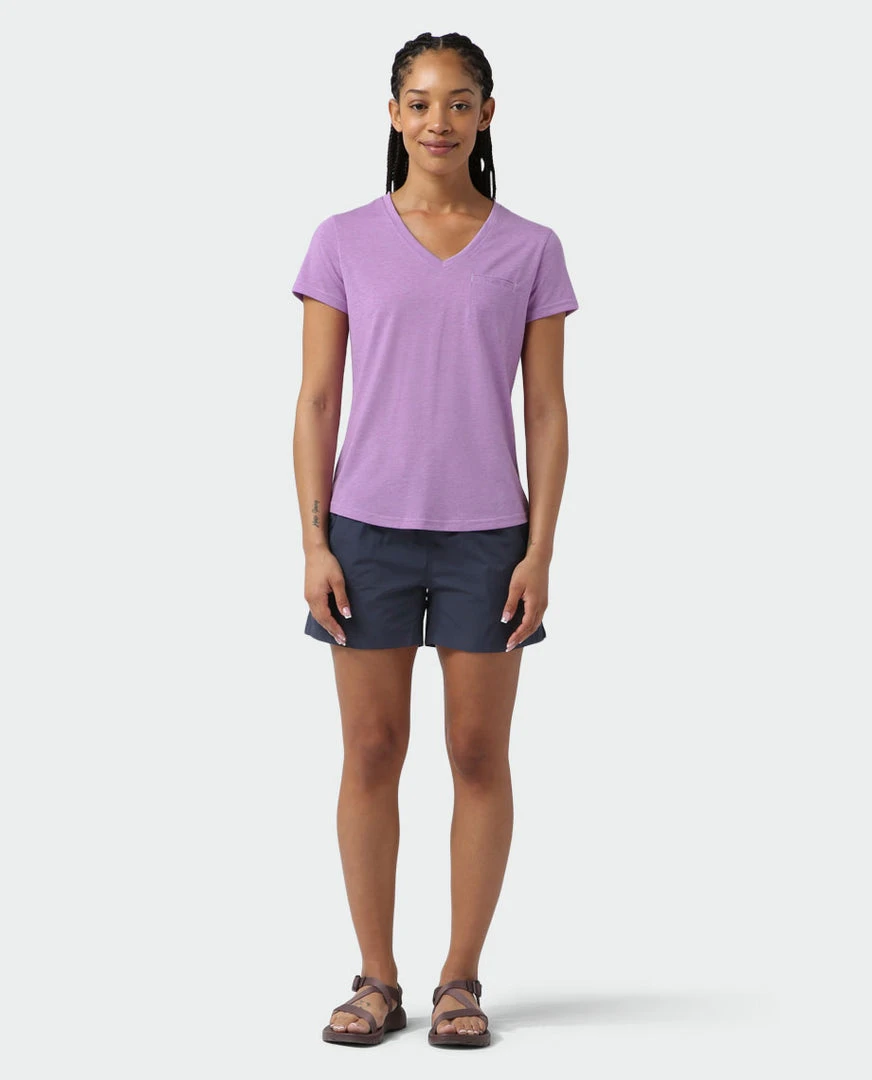 Sleek yet soft drirelease® fabric dries quickly and a moderate V-neck offers a feminine fit, making this top a power play for the daily motion of mountain life.